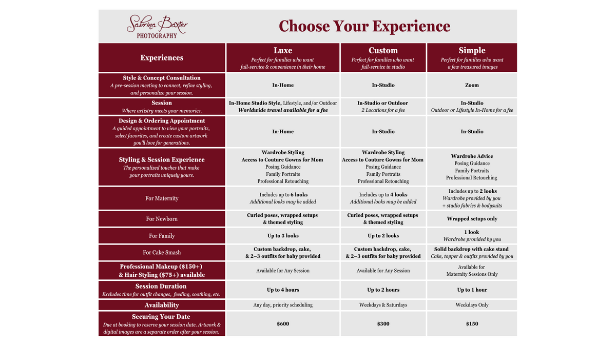Your portrait experience should feel as unique as your family. Whether you’re documenting your pregnancy, welcoming your newborn, gathering as a family, or marking a milestone, every season deserves to be celebrated with artistry and intention. The chart below will help you explore the three session types I offer: Luxe, Custom, and Simple. Each thoughtfully crafted with care to ensure portraits you’ll cherish forever.